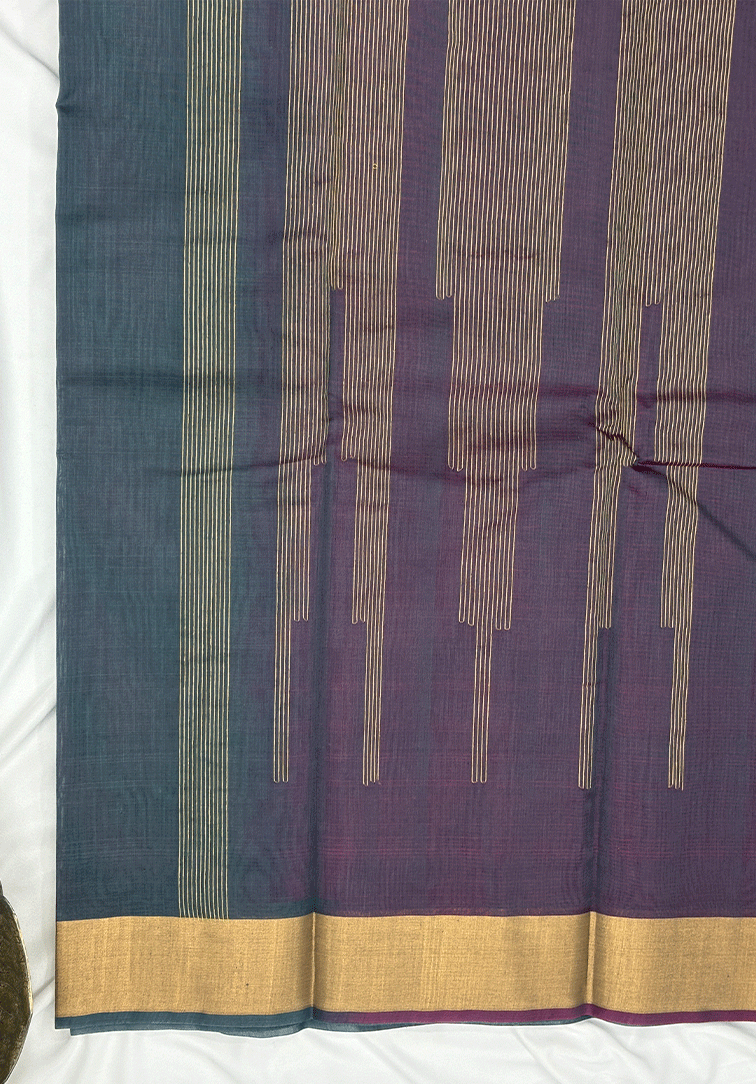 This elegant pure handloom cotton silk saree features a sophisticated pewter blue body, intricately woven with antique zari and chikoo thread detailing in an all-over design that adds depth, texture, and timeless elegance. The subtle metallic undertone of the pewter blue enhances the richness of the weaving while showcasing the finesse of traditional handloom craftsmanship. The saree is complemented by a self-colour antique zari plain Bavanji border, offering a refined and understated frame that enhances the body without overpowering its intricate detailing. Completing the ensemble is a contrast dual-tone blouse in shades of pewter blue and pink, thoughtfully designed with a plain border to create a balanced and polished finish. Soft, breathable, and comfortable to drape, this handloom cotton silk saree is ideal for festive occasions, traditional ceremonies, and elegant celebrations. A graceful blend of heritage artistry, subtle luxury, and enduring handloom craftsmanship.