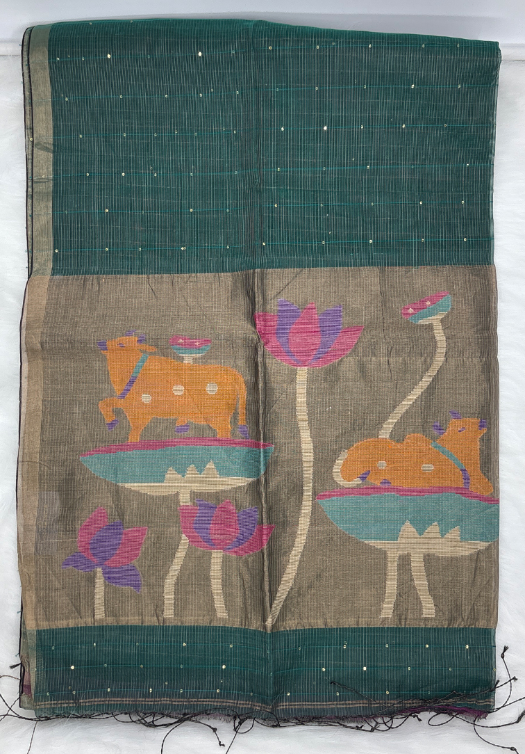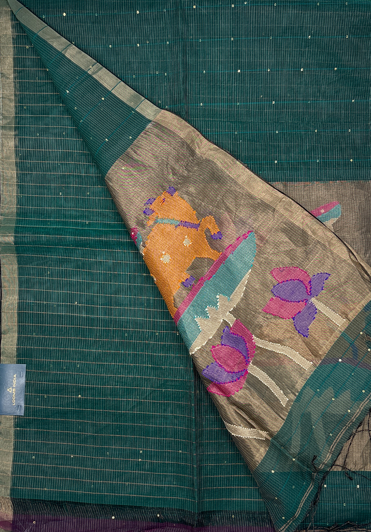 A graceful tissue Kora silk saree in a rich pine green hue, adorned with delicate vertical golden sequin work across the body that adds a subtle shimmer and refined texture. The saree is finished with an antique small zari border, lending a timeless and understated elegance. The matching pine green blouse complements the saree beautifully, featuring all-over vertical antique zari lines that enhance the cohesive and sophisticated look. Perfect for festive gatherings, elegant evenings, and traditional occasions, this saree effortlessly blends minimal artistry with classic charm.