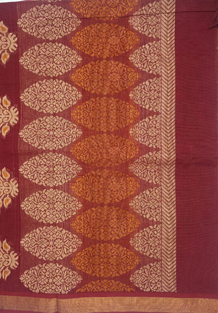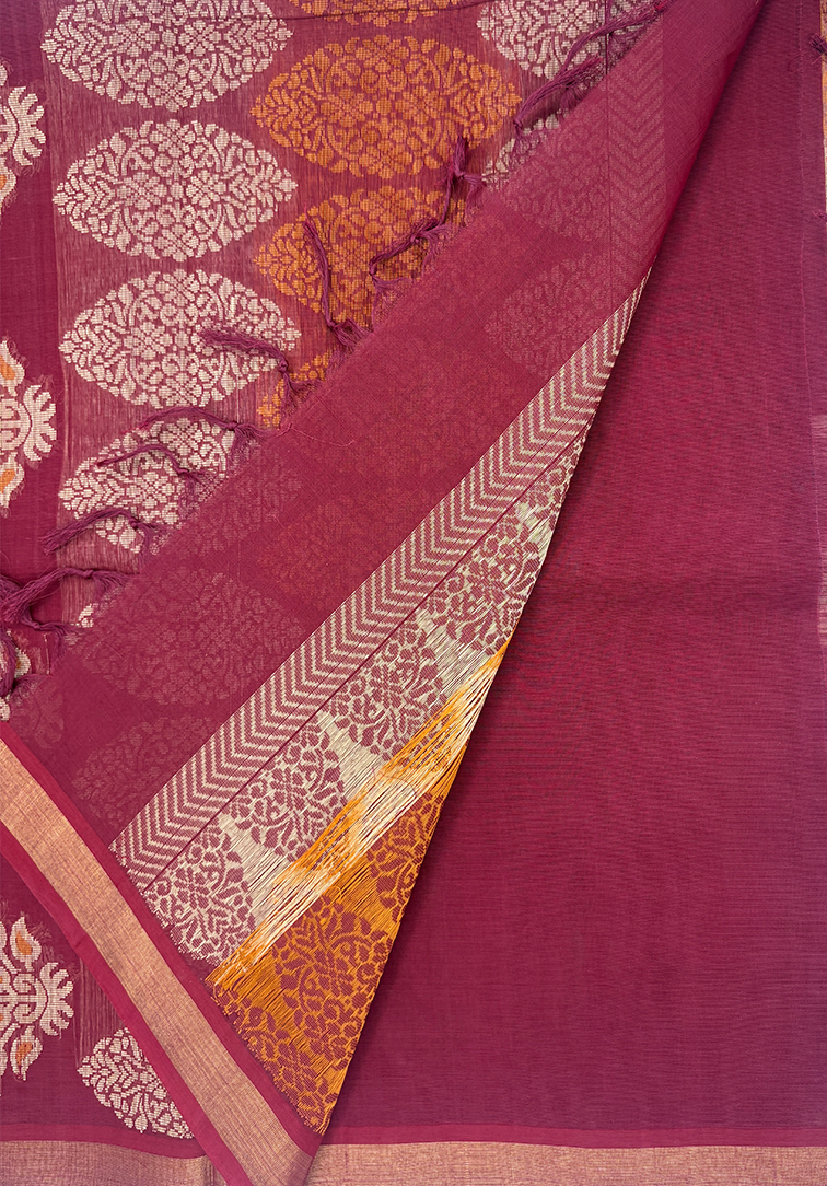 A soothing muted pink handloom cotton saree highlighted with all-over beige and maroon mango thread weaving, celebrating classic South Indian motifs. The saree is beautifully framed with a contrast seaweed green border, adding depth and refinement. Finished with a contrast seaweed green blouse, this piece is understated, graceful, and effortlessly timeless. Perfect for those who love heritage weaves with a calm, earthy palette