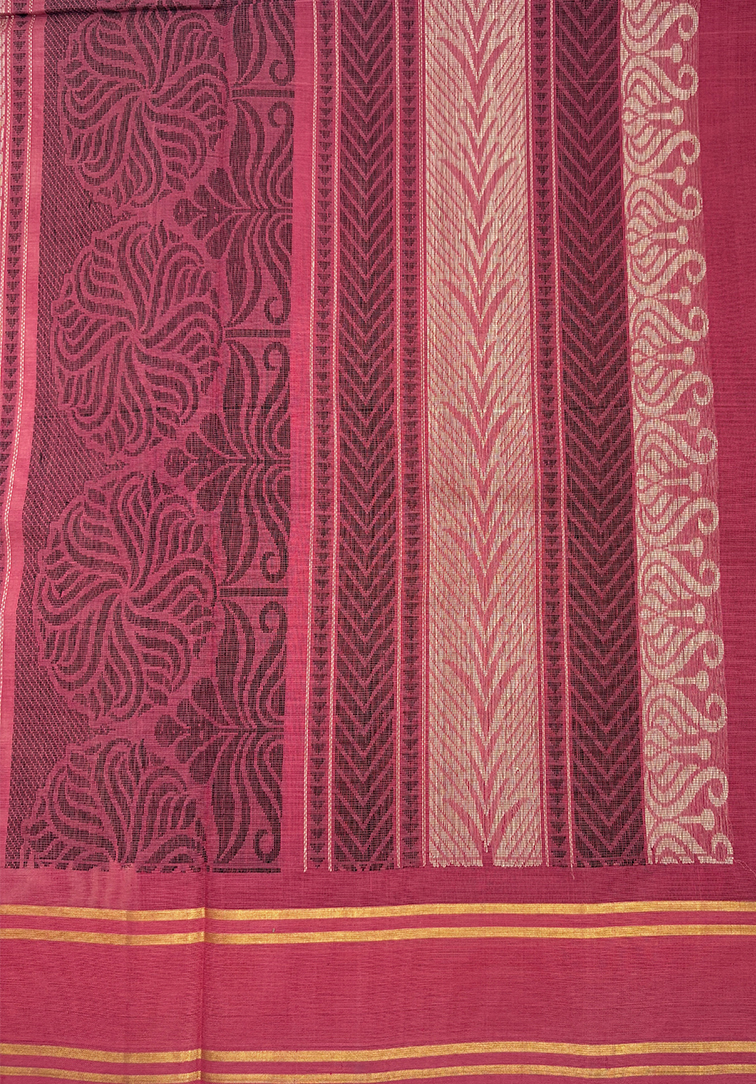 This elegant pure handloom cotton saree features a soft light pink body that exudes gentle charm and timeless grace. The body is beautifully enhanced with subtle vertical line weaving, adding texture and an elongating visual appeal to the drape. The saree is finished with a contrasting dark pink border, creating a rich and elegant frame that enhances the delicate body colour. Completing the ensemble is a matching contrast dark pink blouse, thoughtfully designed to provide a balanced and polished finish. Soft, breathable, and comfortable to drape, this handloom cotton saree is ideal for daily wear, office wear, and understated festive occasions. A perfect blend of comfort, simplicity, and traditional craftsmanship.