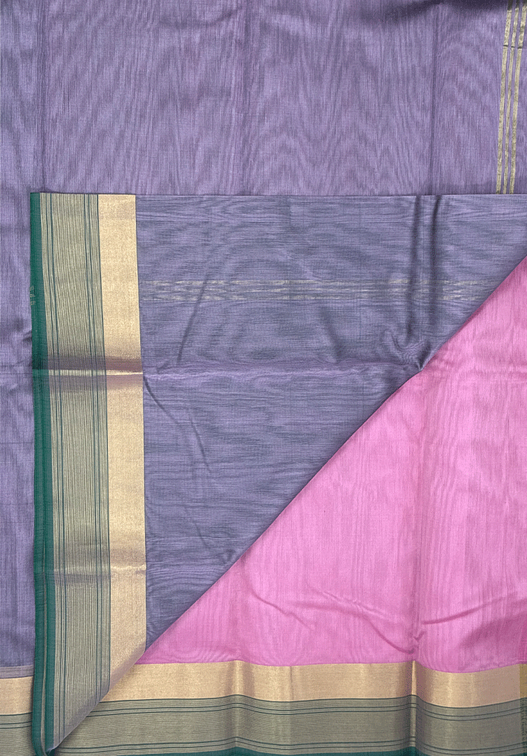 This elegant pure handloom cotton silk saree features a charming plain pink body that radiates softness and timeless grace. The subtle simplicity of the body creates a beautiful contrast with the richly detailed border, making the saree both graceful and eye-catching. The saree is finished with a deep dark green border, intricately woven with zari work that adds traditional richness and a gentle shimmer. Complementing the saree is a matching dual-tone blouse in dark green and pink, thoughtfully designed with a coordinated zari border to complete the ensemble with a harmonious and polished finish. Soft, breathable, and comfortable to drape, this handloom cotton silk saree is ideal for festive celebrations, traditional ceremonies, and elegant daytime or evening occasions. A perfect blend of delicate color tones and classic handloom craftsmanship.