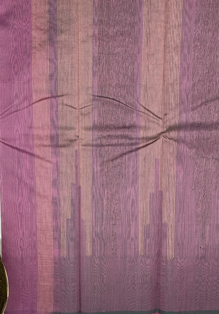 This elegant pure handloom cotton silk saree features a graceful plain pink body, radiating soft charm and timeless sophistication. The gentle hue of the body creates a beautiful canvas that highlights the richness of the traditional border. The saree is adorned with a statement one-side border, intricately woven with antique and golden zari in a classic temple design running along the entire border. This architectural motif adds heritage elegance, traditional richness, and a subtle regal shimmer to the drape. Completing the ensemble is a matching dual-tone blouse in shades of mustard and pink, thoughtfully designed to provide a warm yet harmonious contrast. Soft, breathable, and comfortable to drape, this handloom cotton silk saree is ideal for festive occasions, temple ceremonies, and elegant celebrations. A refined blend of delicate colour tones, traditional artistry, and authentic handloom craftsmanship.