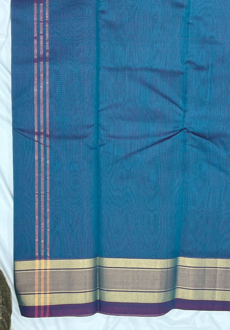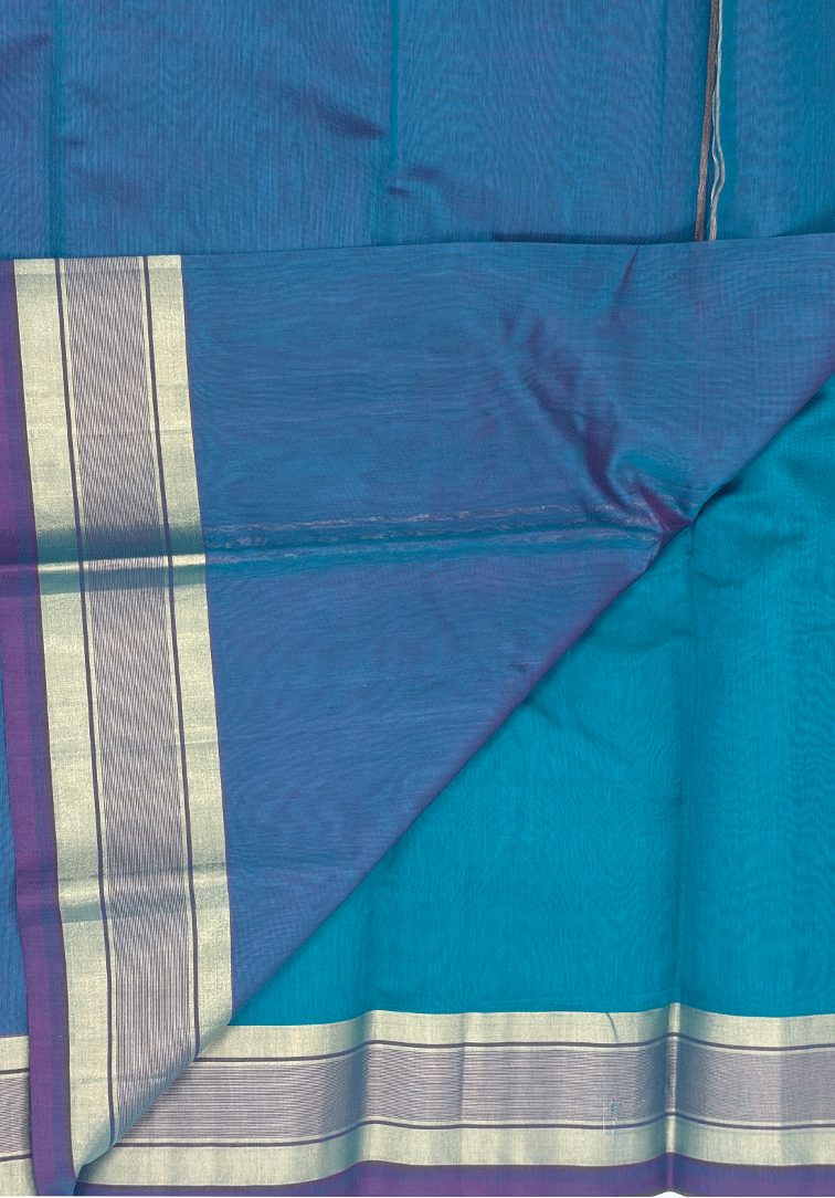 This elegant pure handloom cotton silk saree features a serene plain Rama blue body, offering a graceful and soothing appeal with timeless charm. The understated body beautifully highlights the contrasting borders, creating a balanced and sophisticated look. The saree is enhanced with striking contrast borders in a dual tone of purple and Raama blue, adding depth and visual interest to the drape. Completing the ensemble is a matching dual-tone blouse in shades of purple and blue, designed to complement the saree seamlessly and create a cohesive, polished finish. Soft, breathable, and comfortable to drape, this handloom cotton silk saree is ideal for festive occasions, traditional gatherings, and special celebrations. A perfect blend of subtle elegance, rich color contrast, and classic handloom craftsmanship.
