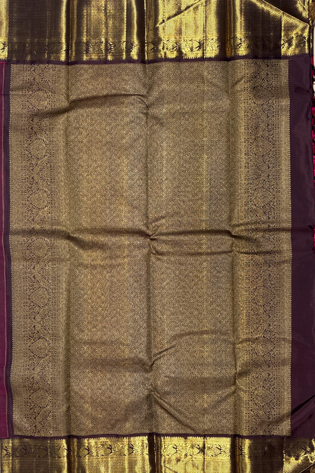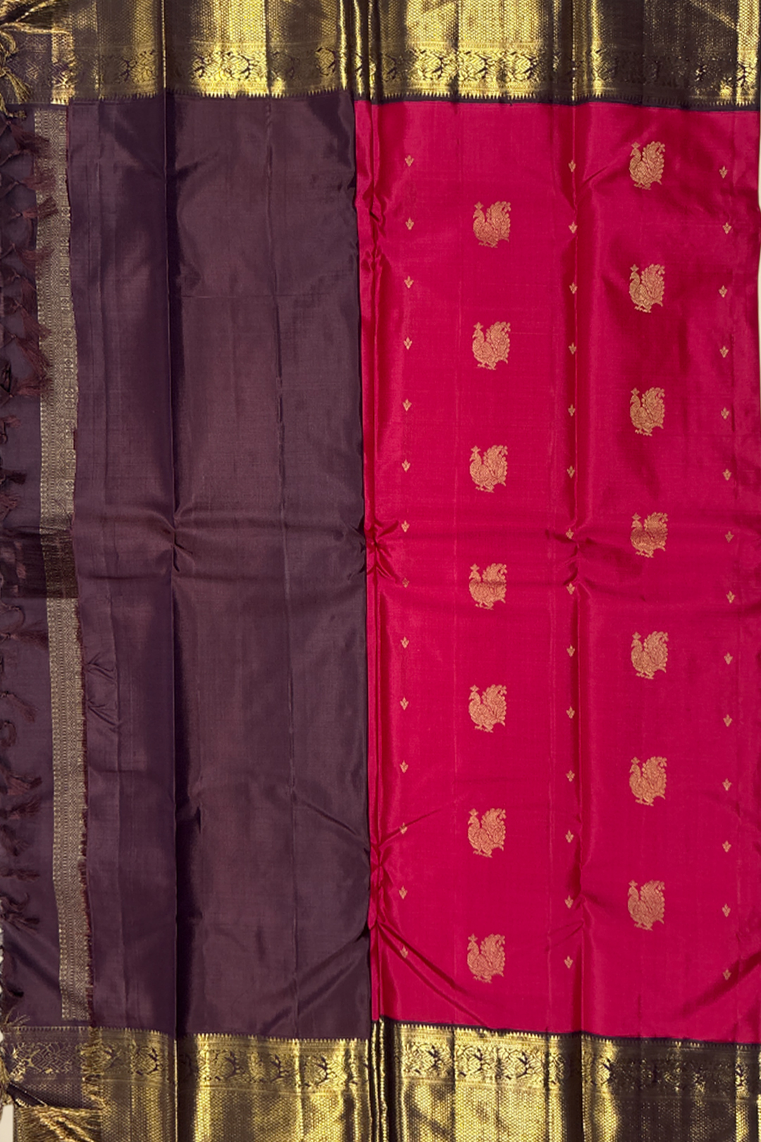 This regal pure Kanchipuram handloom saree showcases the grandeur of traditional South Indian weaving in its finest form. The rich red and pink dual-tone body shimmers beautifully, adorned with intricately woven golden zari Annapakshi motifs that symbolise divine protection and prosperity. The subtle play of dual tones adds depth and elegance, making the saree visually captivating from every angle. Enhancing its majestic appeal is the contrast coffee-brown border, richly detailed with classic Mayilkan (peacock eye) and Annapakshi zari motifs, reflecting heritage artistry and timeless beauty. The pallu is a masterpiece in itself, featuring elaborate Rudrakshi and Annapakshi motifs woven in lustrous golden zari, lending a sacred and auspicious character to the saree. Paired with a contrast coffee-brown blouse that complements the border and pallu perfectly, this saree is handwoven in pure silk with authentic zari by master Kanchipuram weavers. Ideal for weddings, bridal wear, temple ceremonies, and grand festive occasions, this Kanchipuram handloom saree is a treasured heirloom that embodies tradition, elegance, and cultural richness.