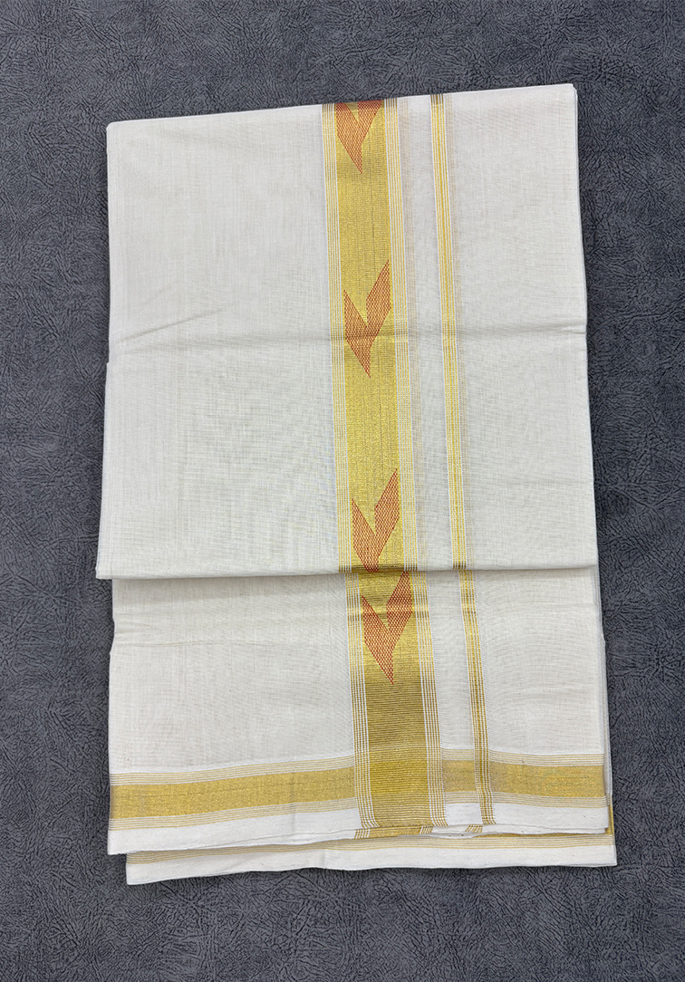 Pure handloom Kasavu mundu crafted in a classic off-white base, highlighted with an elegant red designer motif that adds a rich and festive contrast. Finished with traditional kasavu detailing, this mundu reflects authentic Kerala handloom craftsmanship and is ideal for temple wear, festive occasions, and cultural ceremonies.