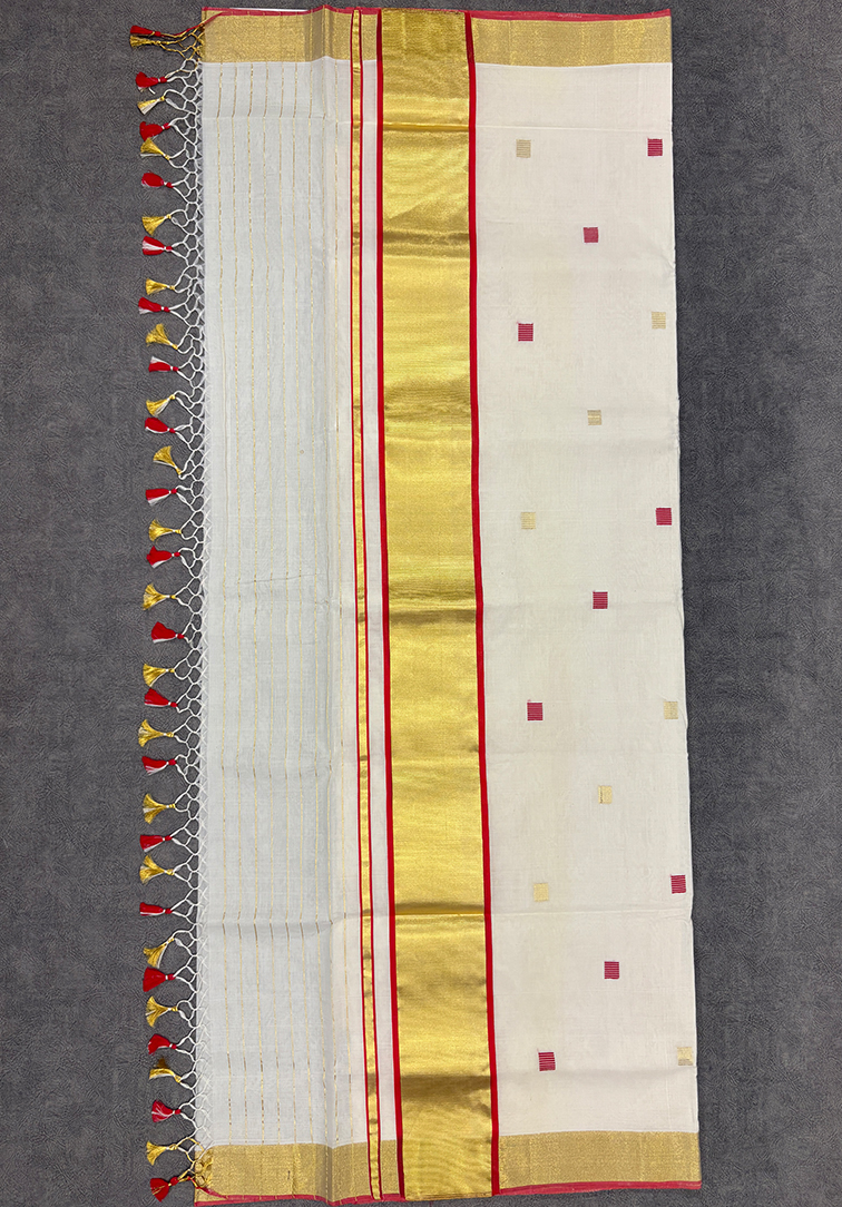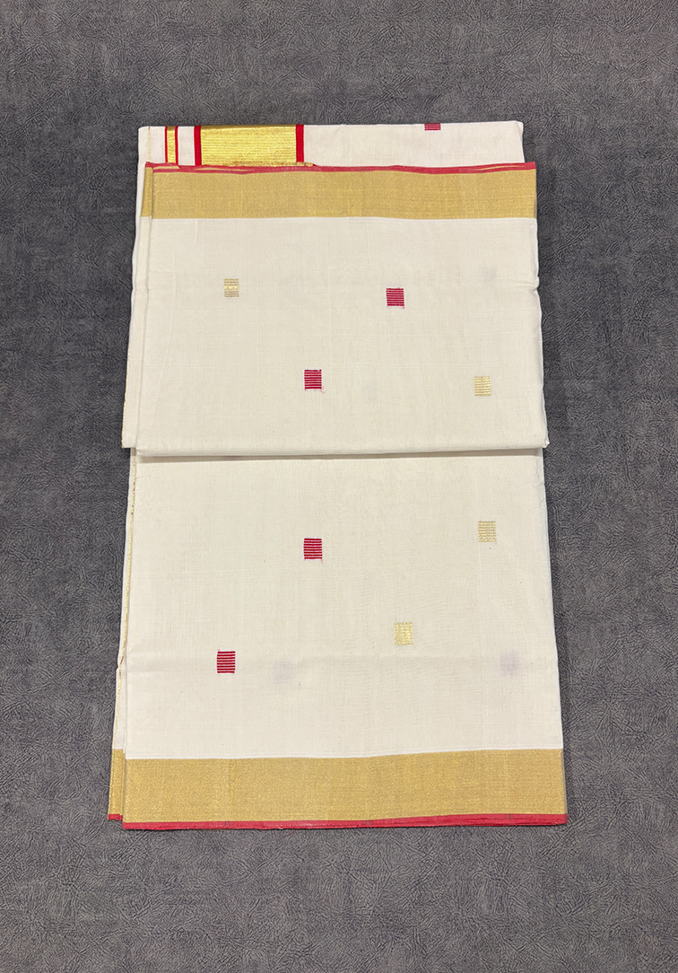 PURE UNAKUPAVU BALARAMAPURAM, KERALA HANDLOOM KASAVU SAREE This classic pure handloom Kerala Kasavu saree is a beautiful expression of tradition with a striking touch of colour. The body is adorned with block designs throughout in rich red tones, tastefully highlighting the saree while preserving the understated elegance of the Kasavu weave. The saree is complemented by a traditional red and gold pallu, adding festive richness and visual depth to the drape. Subtle red highlights across the body enhance the overall aesthetic, creating a harmonious balance between heritage craftsmanship and vibrant detailing. Perfect for Onam celebrations, temple visits, festive occasions, and cultural gatherings, this pure handloom Kerala Kasavu saree is a timeless choice that blends authenticity, artistry, and graceful elegance.