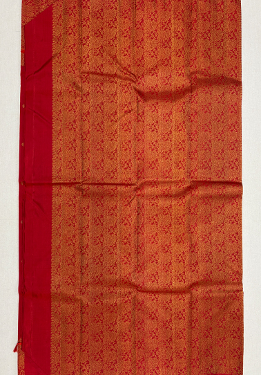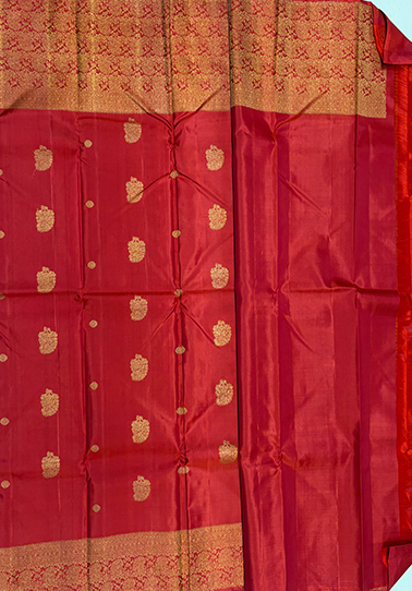 • Weave: Pure Kanchipuram handloom with intricate Mughal butta detailing • Body Colour: Red • Design: Mughal buttas across the body • Border: Self-colour one-side broad Banarasi border • Blouse: Self-colour blouse with matching border • Occasion: Ideal for weddings, festive wear, traditional functions, and cultural celebrations