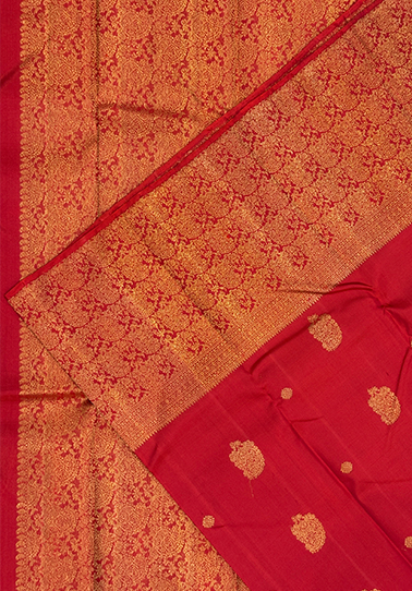 • Vibrant red body enhanced with intricate Mughal buttas • Authentic pure Kanchipuram handloom craftsmanship ensuring a premium finish • One-side broad Banarasi border for a regal yet balanced look • Coordinated self-colour blouse with matching border for a polished ensemble • Smooth texture with graceful drape and subtle sheen • A timeless saree perfect for festive, ceremonial, and heirloom-worthy occasions