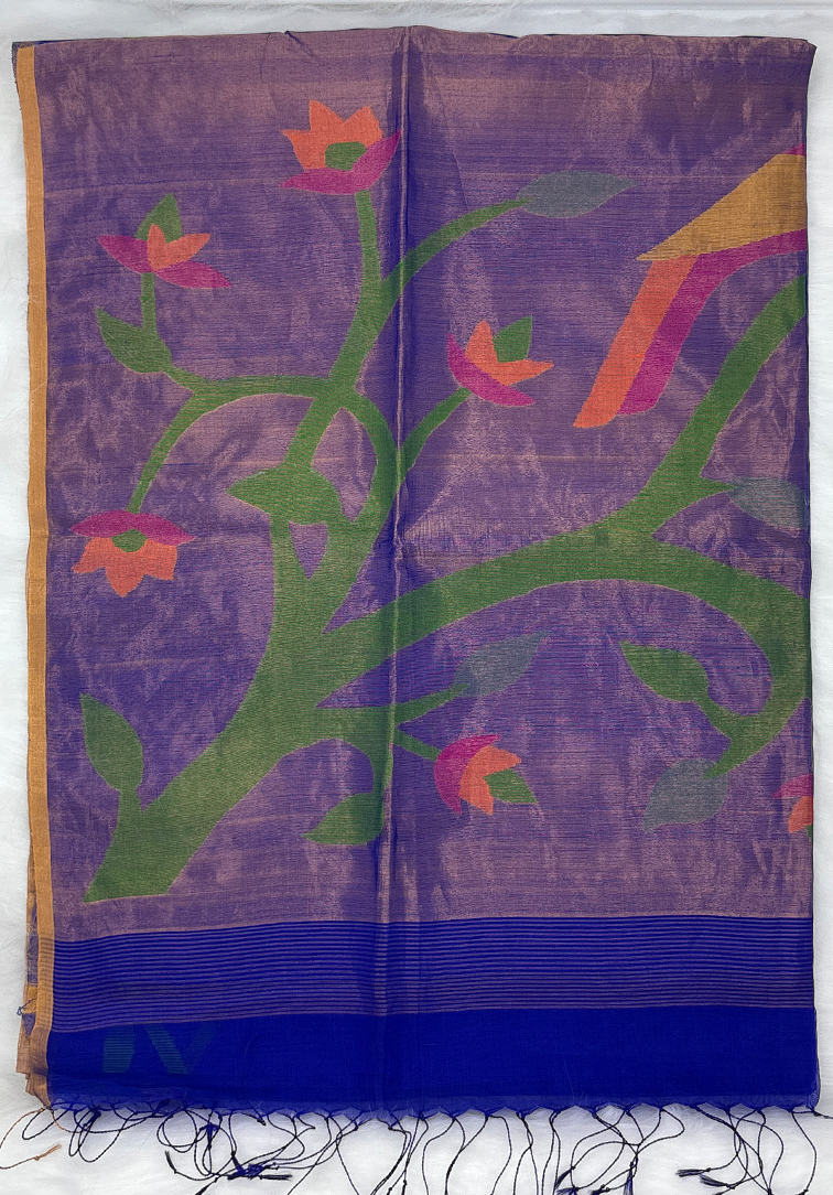 An embodiment of timeless elegance, this Kora silk saree is crafted in a deep royal blue shade that exudes richness and sophistication. The plain body allows the natural sheen and airy texture of Kora silk to take center stage, creating a look that is both graceful and effortlessly refined. The saree is beautifully framed with an all-over Jamdani thread work border, meticulously woven to add subtle texture and artisanal charm. The border is finished with delicate zari piping, lending a gentle sparkle that enhances the saree without overpowering its understated beauty. Completing the ensemble is a royal blue linen cotton blouse, thoughtfully designed for comfort and versatility. The blouse features a refined zari piping border, perfectly complementing the saree and adding a cohesive, polished finish. Ideal for festive celebrations, elegant daytime functions, and intimate traditional gatherings, this Kora silk saree is a perfect choice for those who appreciate minimal aesthetics paired with fine craftsmanship.