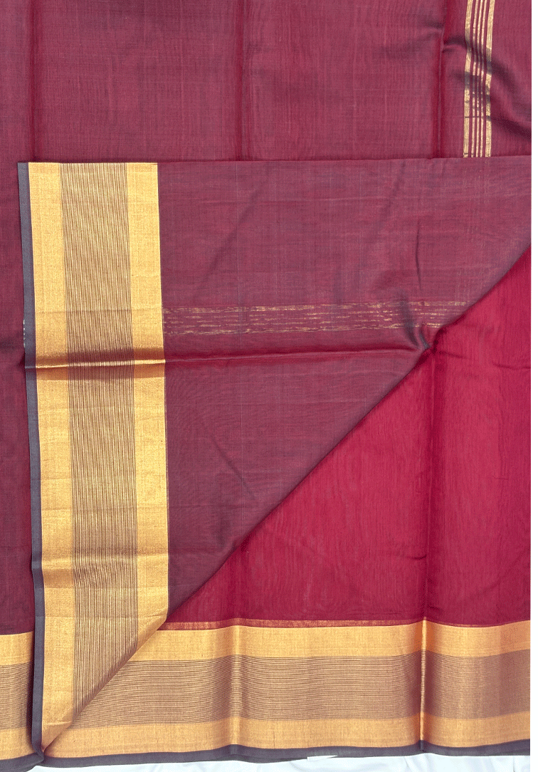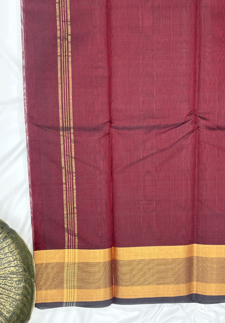 This elegant pure handloom cotton silk saree features a warm plain muted rust body, exuding earthy sophistication and timeless charm. The subtle richness of the body creates a graceful canvas that beautifully highlights the contrasting border. The saree is enhanced with a striking dual-tone border in shades of green and muted rust, intricately woven with zari work that adds depth, texture, and a refined traditional shimmer. Completing the ensemble is a matching dual-tone blouse in green and rust, thoughtfully finished with a coordinated zari border for a seamless and polished look. Soft, breathable, and comfortable to drape, this handloom cotton silk saree is ideal for festive occasions, cultural gatherings, and special celebrations. A perfect blend of elegant colour contrasts, classic zari detailing, and authentic handloom craftsmanship.