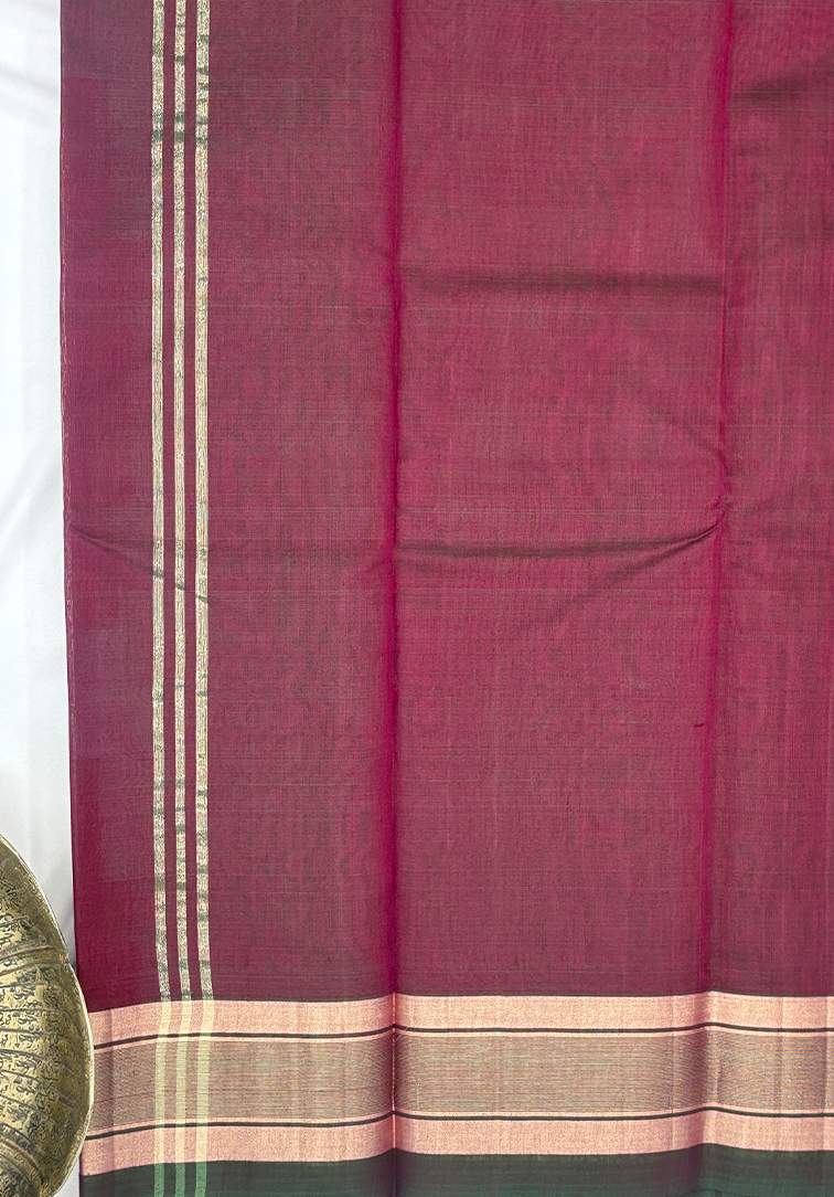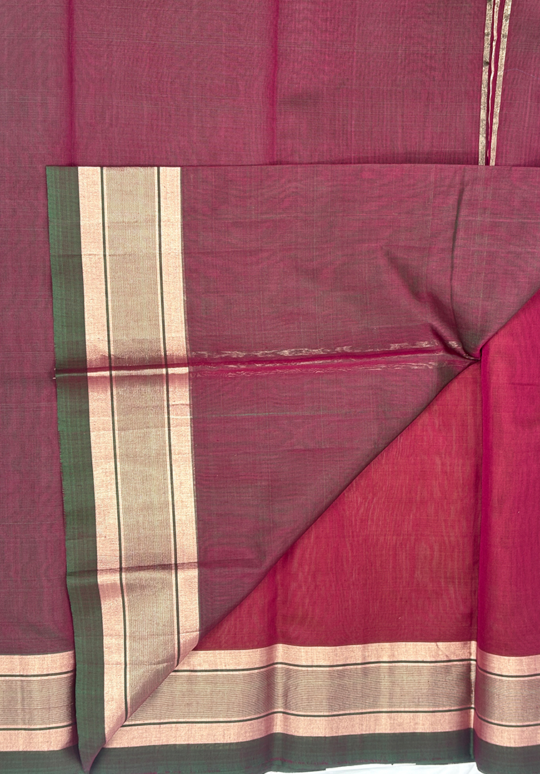 This elegant pure handloom cotton silk saree features a warm plain muted rust body, offering a graceful and earthy appeal rooted in timeless tradition. The subtle tone of the body provides a beautiful canvas that enhances the richness of the contrasting border. The saree is highlighted with a striking dual-tone border in shades of green and muted rust, intricately woven with zari work that adds depth, texture, and a gentle traditional shimmer. Completing the ensemble is a matching dual-tone green and rust blouse, thoughtfully finished with a coordinated zari border for a seamless and polished look. Soft, breathable, and comfortable to drape, this handloom cotton silk saree is ideal for festive celebrations, cultural gatherings, and special occasions. A perfect blend of natural hues and classic handloom craftsmanship.