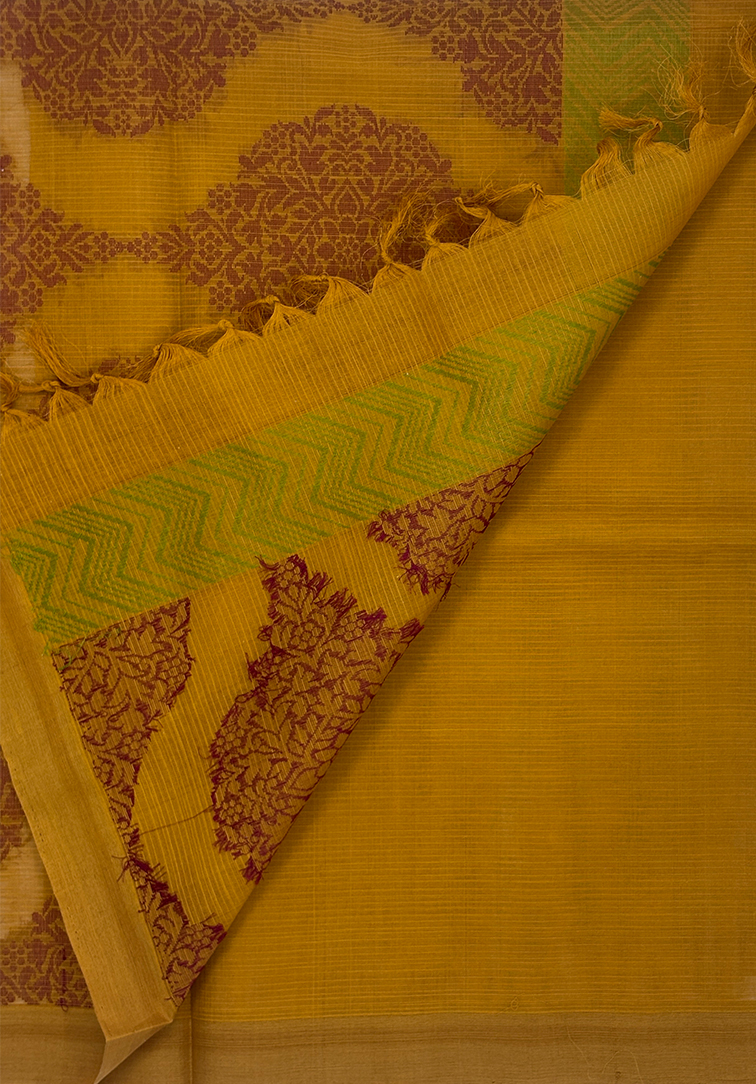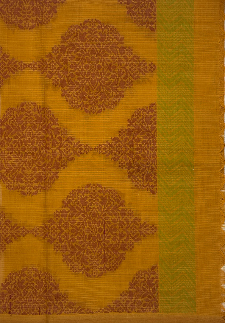 Exude timeless sophistication with this luxurious pure handloom cotton saree, beautifully crafted with refined detailing. The body comes in a soft sandal hue, elegantly enhanced with intricate green and maroon thread designs woven all over, adding rich depth and artisanal charm. A striking contrast plain mustard yellow border lends a warm, contemporary touch while maintaining traditional elegance. Completing the ensemble is a perfectly coordinated contrast mustard yellow blouse, creating a harmonious and elevated finish. An exquisite choice for festive occasions, traditional gatherings, and elegant celebrations, this saree reflects the beauty of heritage craftsmanship blended with understated luxury.