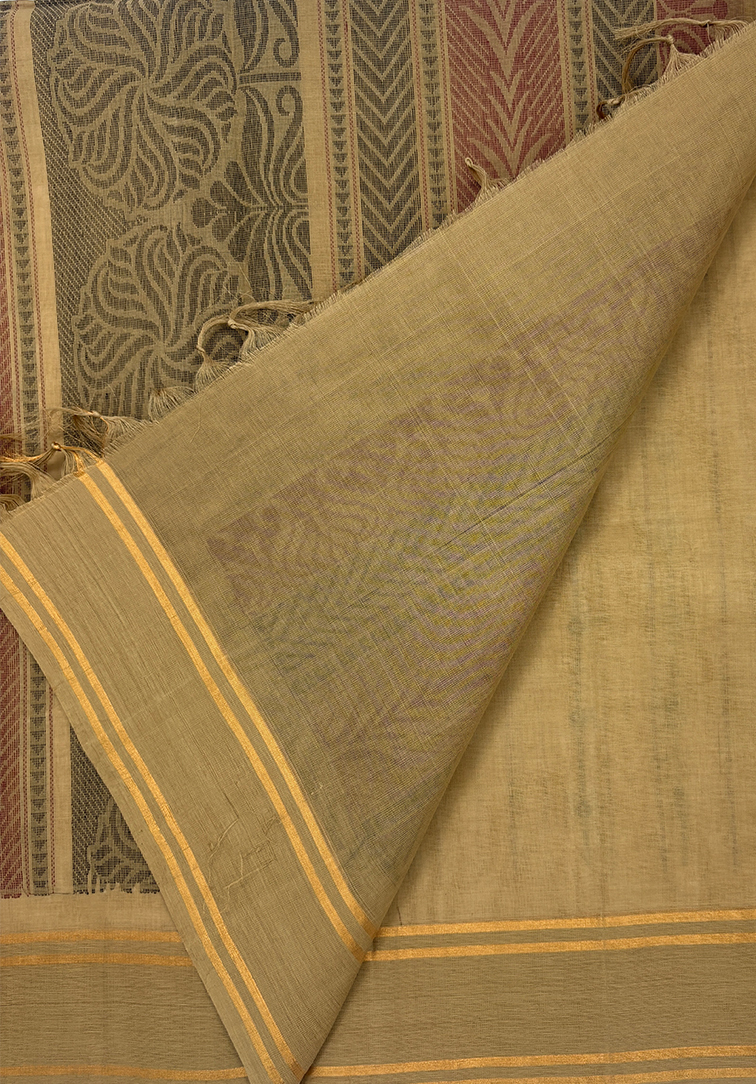 A serene light sandal–coloured handloom cotton saree enhanced with all-over vertical black and maroon thread weaving, creating a subtle yet striking pattern. The saree is finished with a light sandal-brown border, maintaining a soft, harmonious look. Paired with a contrast sandal-brown blouse, this piece feels calm, elegant, and timeless. An understated palette with strong linear detailing — perfect for effortless everyday sophistication