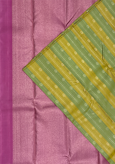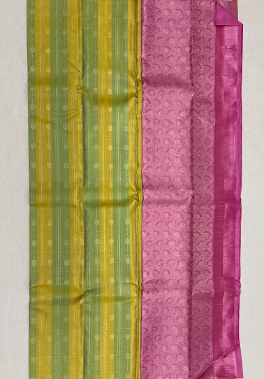 • Weave: Pure Kanchipuram handloom with zari motifs and line detailing • Body Colour: Multi-colour (lemon yellow and light green vertical stripes) • Design: Vertical stripes with subtle zari motifs and lines • Border: None (borderless design for a clean, modern look) • Blouse: Light pink with floral brocade detailing • Occasion: Perfect for weddings, festive wear, traditional ceremonies, and elegant day functions