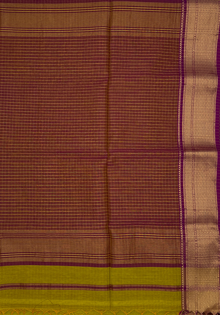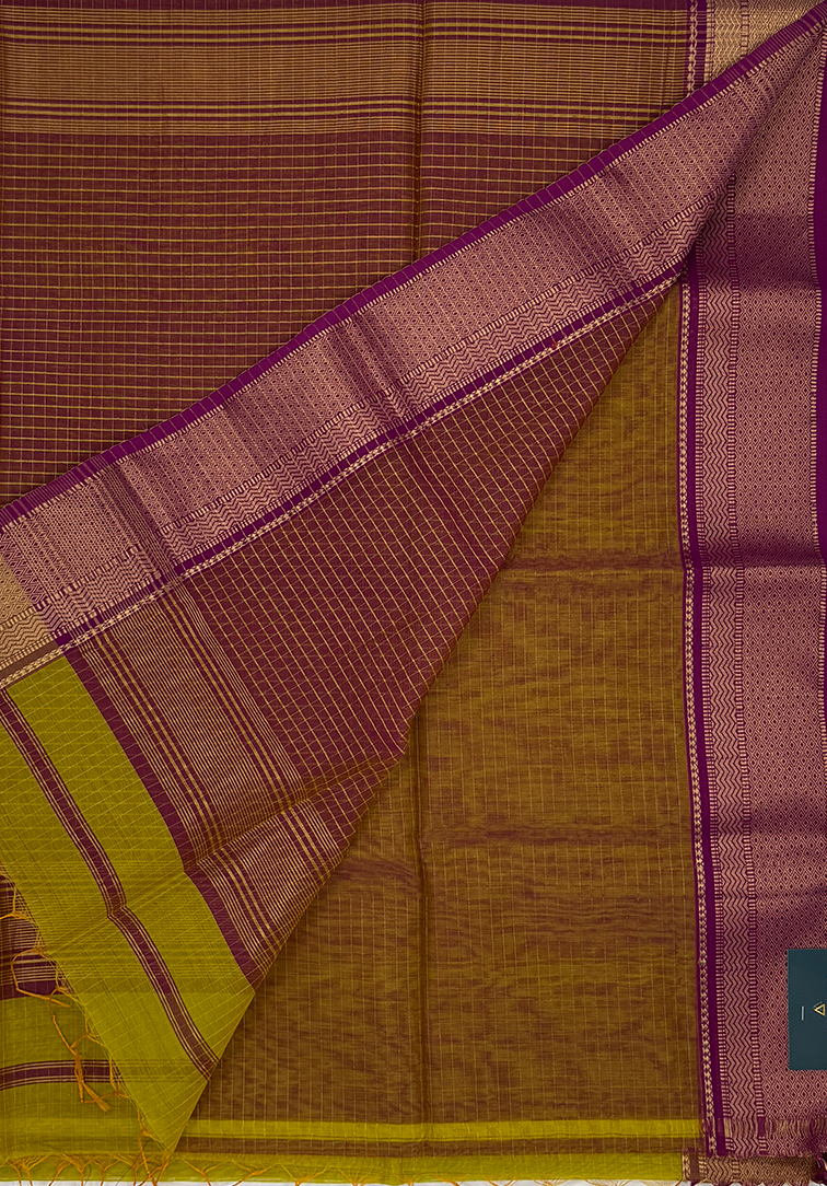 This elegant Maheshwari handloom saree features a refreshing yellowish green body highlighted with fine zari lines that add a gentle shimmer and refined texture. Woven in the traditional silk-cotton blend that defines Maheshwari sarees, it is lightweight, breathable, and offers a crisp, graceful drape ideal for all-day comfort. The saree is beautifully framed with a distinctive dual-tone border in magenta and khaki, enriched with classic zari detailing that adds depth and contrast. Paired with a coordinated dual-tone magenta and khaki blouse adorned with zari lines and a zari-finished border, this timeless creation reflects the essence of Maheshwari craftsmanship—subtle elegance, durability, and understated luxury—making it perfect for festive occasions, cultural gatherings, and polished everyday wear.